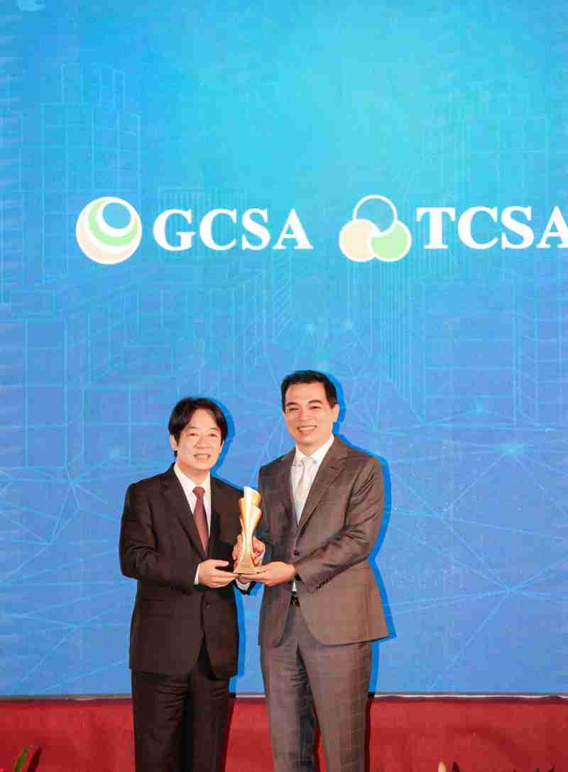 达全方位永续表现获全球永续奖及台湾永续奖肯定,,由副总统赖清德颁奖 (左),,OBPay总经理柯富仁 (右) 代表领奖