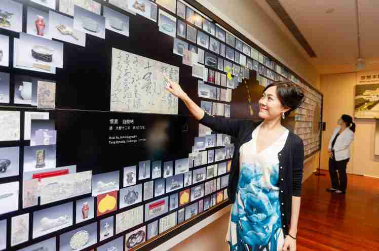 故宫智能文物互动导览墙的设计灵感源自多宝格文物,,,,可让多人同时透过各类互动手势浏览故宫精彩的文物图像。。